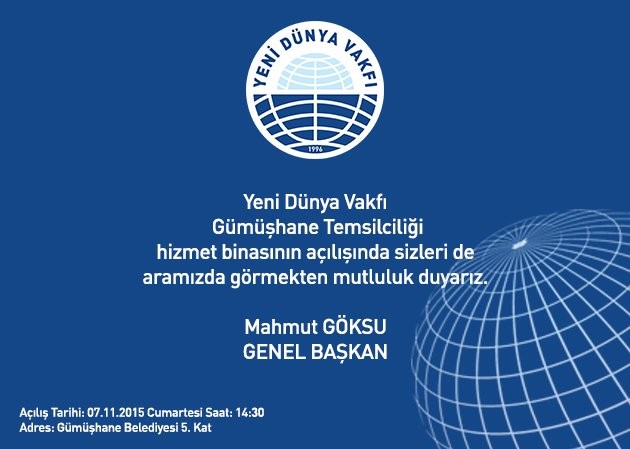 Genel Başkan Mahmut Göksu, Mütevelli Heyet Üyelerimiz ve Yöneticilerimizin de katılımlarıyla gerçekleşecek olacak Yeni Dünya Vakfı Gümüşhane Temsilciliği açılış töreninde dostlarımızı da aramızda görmek bizleri mutlu edecektir.