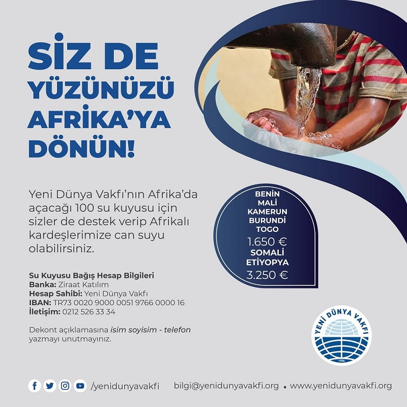 Bu kapsamda Afrika’da su kuyuları açmayı planlıyoruz. Çünkü her insan gibi onların da temizlenip Allah’ın nimetinden rızıklanmaya hakları var. Bu topraklarda yaşayan milyonlarca mümin kardeşimiz de gönüllerince abdestlerini almalı ve temizlenmelidir. Temizlik bir Müslümanın imanının yarısıdır.