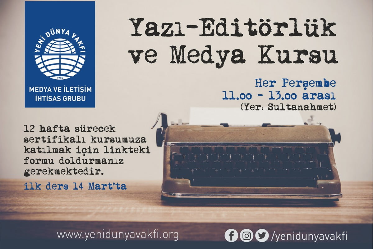 Yeni Dünya Vakfı genel merkezi tarafından 12 hafta süre ile sertifikalı “Yazı-Editörlük ve Medya Kursu” düzenlenecektir. Kurs, Milli Eğitim Müdürlüğü’ne bağlı tek müze olan Cumhuriyet Eğitim Tarihi Müzesi’nin tarihi dokudaki dersliğinde düzenlenecektir.