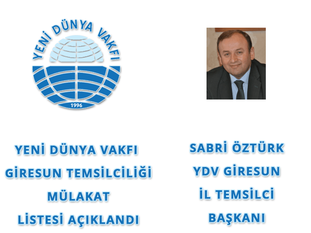 Yeni Dünya Vakfı Giresun Temsilci Başkanı Av. Sabri Öztürk Giresun ili için mülakat listelerinin açıklandığını duyurdu.